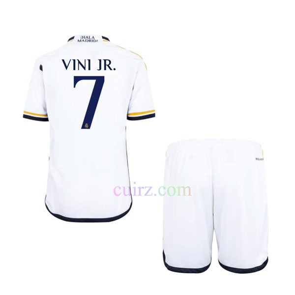 La camiseta Vinicius Real Madrid 1ª equipación 2023 2024 niños continúa su aspecto clásico con una paleta de colores totalmente blanca. acentuada con dorado-naranja y azul marino para rendir homenaje a la antigua camiseta. El buen tejido transpirable hace que sea mucho más cómoda de llevar.